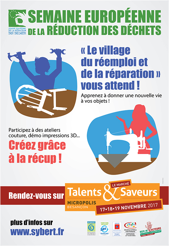 A l’occasion de la semaine Européenne de réduction des déchets fixée cette année du 18 au 26 novembre 2017, le SYBERT et la Chambre des Métiers et de l’Artisanat installeront un « village de la réparation et du réemploi » sur le Marché Talents et Saveurs qui se déroulera à Micropolis du 17 au 19 novembre 2017.
